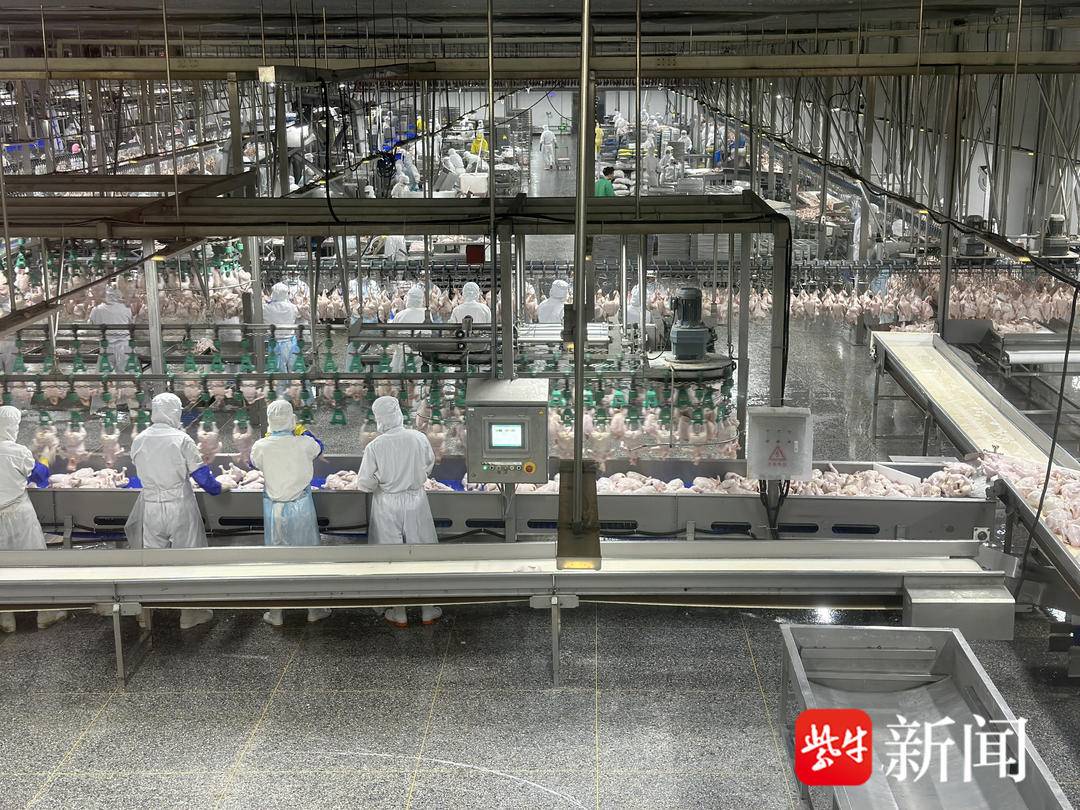 在徐州润客食品有限公司肉鸡屠宰加工车间内,全自动化机械设备正在高效地对肉鸡进行除毛、清洗、输送等自动化流水作业。近年来,新河镇大力发展肉鸡养殖业,截至目前,全镇已建成养殖厂6个,建设智能化肉鸡养殖棚67座,年出栏肉鸡2010万羽。2020以来,为进一步做大做强肉鸡产业,新河镇克服疫情等阻碍,全力推进润客食品产业园建设,持续推动肉鸡产业一二三产融合发展。2022年,徐州润客食品全年产值达15亿元,年屠宰量达7000万羽,吸纳本地村民家门口就业1800余人,年发放工资1.2亿元。