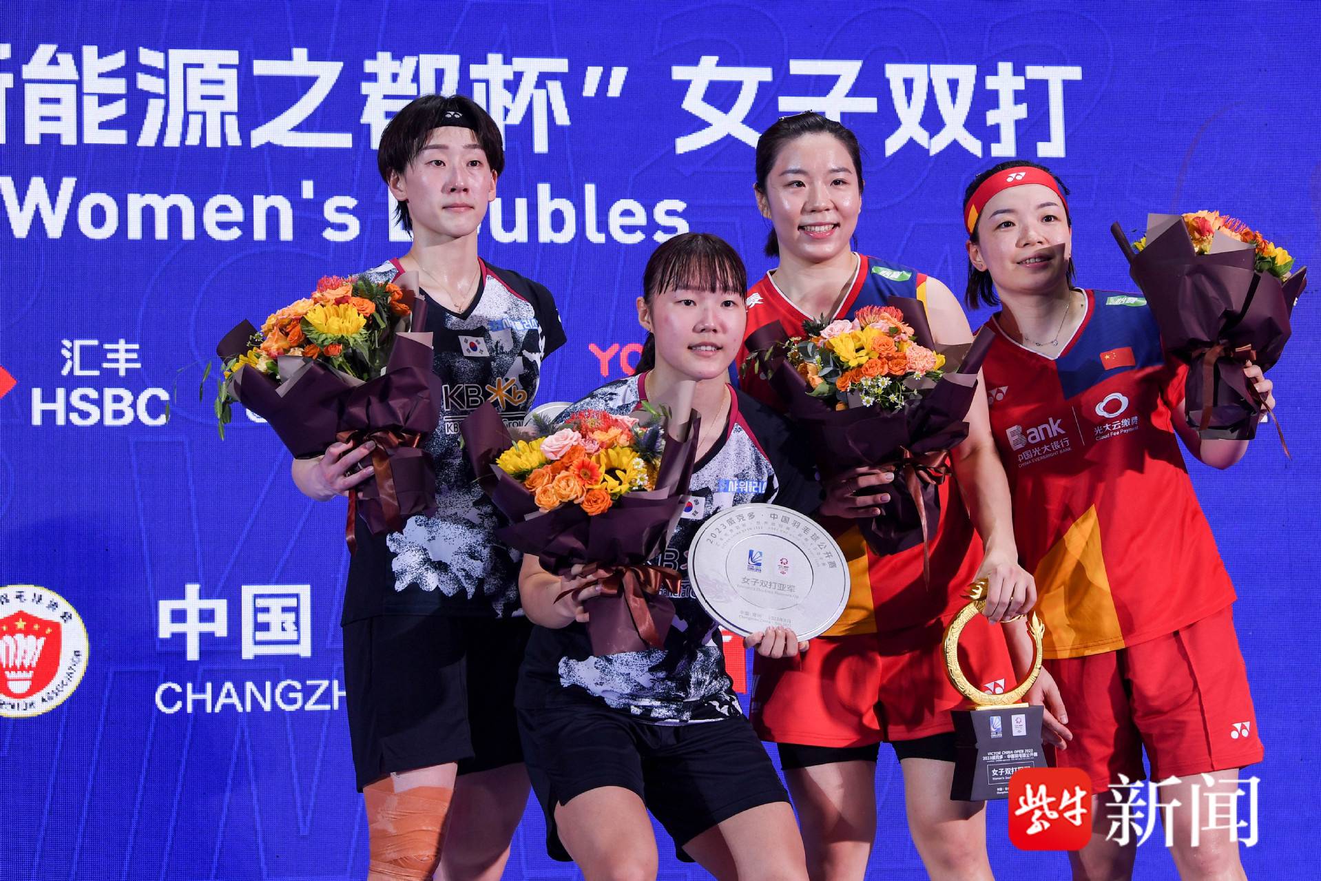 冠军中国组合陈清晨(右一)/贾一凡(右二)和亚军韩国组合白荷娜(左二)/李绍希在颁奖仪式中。
