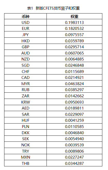 具体来看,CFETS人民币汇率指数篮子中,下调美元货币权重至0.1983,下调欧元货币权重至0.1820,此外,还下调了日元、英镑等权重。