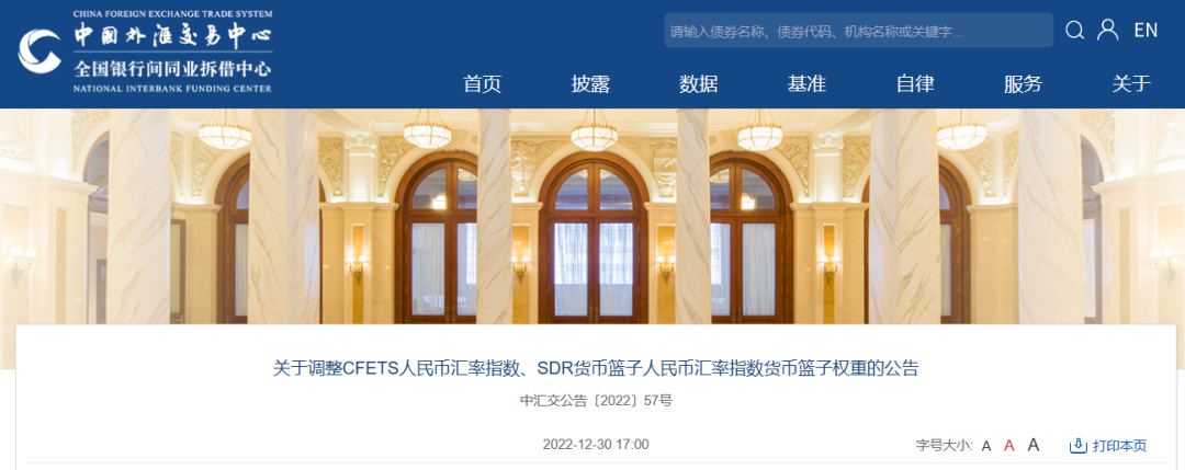 12月30日,中国外汇交易中心发布公告称,自2023年1月1日起,调整CFETS人民币汇率指数、SDR货币篮子人民币汇率指数货币篮子权重。
