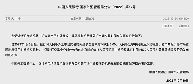 12月30日,人民银行、外汇局发布公告称,决定自2023年1月3日起,延长银行间外汇市场交易时间至次日3:00,覆盖亚洲、欧洲和北美市场更多交易时段。