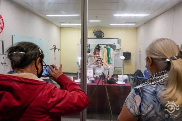 从准备“贴片子”、烫好衣服,再到脸部化妆,也就是俗称的“上彩”。然后戴网巾、吊眼睛,其间进行发式的处理。随后贴片子、梳大头、戴头面……隔着玻璃,眼见沈丰英、沈国芳变身“杜丽娘”、“春香”的妆造细节一一呈现,现场观众不时发出惊叹。