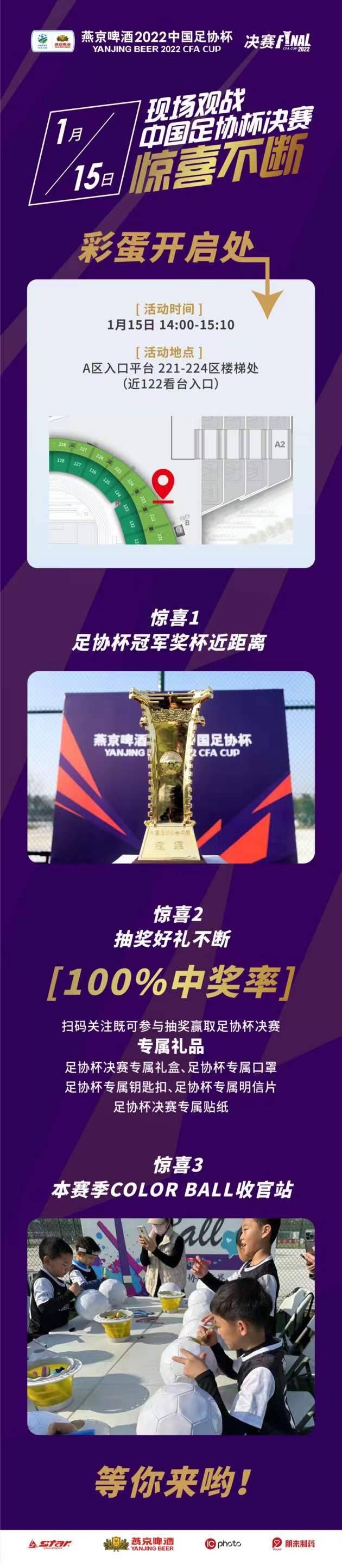 作为2022足协杯赛事的一项延续活动,足协杯冠军奖杯已在成都、唐山、海口、晋江完成了巡展,深受各地球迷与青少年的喜爱。1月15日下午2点起,在现场近距离接触到冠军奖杯的同时,还能参与Color Ball彩绘足球的活动,与专属于苏州的城市打卡墙留影,更有打卡+关注即可赢得抽奖机会,赢取包括足协杯决赛专属礼盒、足协杯苏州专属明信片等好礼。