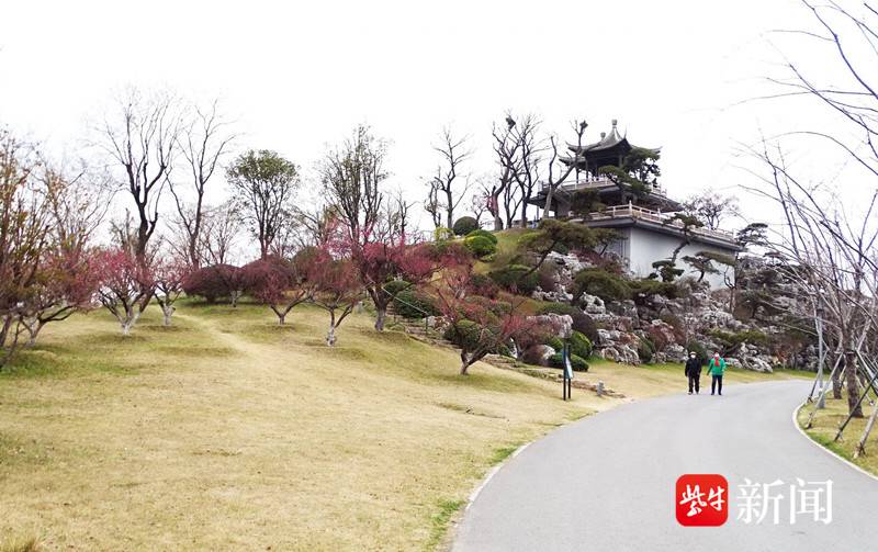 328国道上车辆川流不息,在国道与江都南路交叉口,建设部门也用废土打造了山水景观。同心河南侧,堆起了一座小山,山上建有景观亭,点缀山石。小山上,但见红梅盛开,春意盎然。
