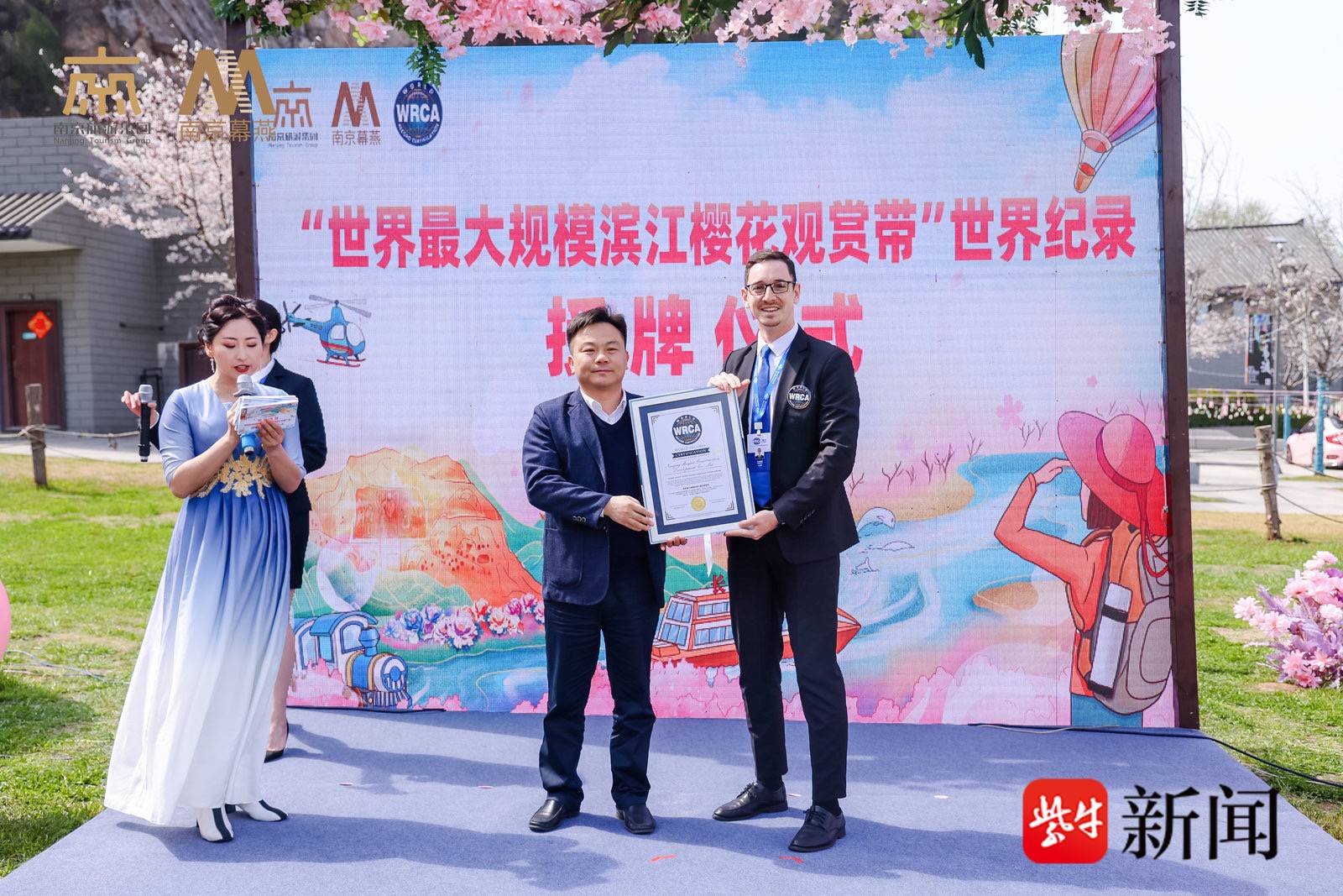幕燕滨江樱花带西起五马渡,东至燕子矶广场,全长3.5公里,共42万平方米、种植有43个品种、5052株樱花,其长度和樱花数量均为全国之最,也是目前国内唯一的“江景樱花”。活动现场,世界纪录认证官员向幕燕颁发了“世界规模最大的滨江樱花观赏带”认证证书。这标志着幕燕滨江樱花带获得了世界纪录的认可,获得了“世界之最”。