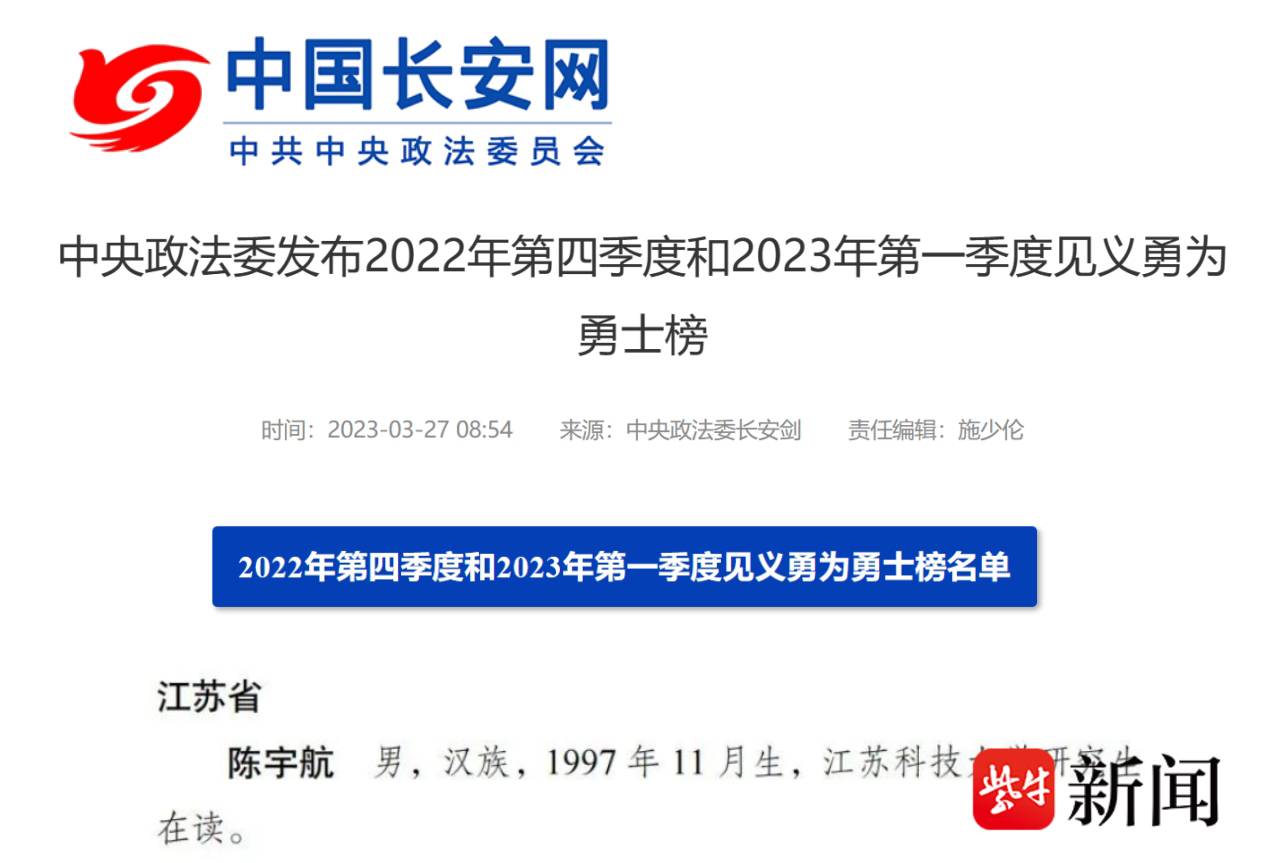 扬子晚报网3月28日讯(通讯员 万旻 记者 万凌云) 3月27日,中央政法委在中国长安网和中央政法委长安剑公众号上发布2022年第四季度和2023年第一季度“见义勇为勇士榜”,共有63位勇士光荣上榜。其中,江苏科技大学材料学院研究生陈宇航上榜。