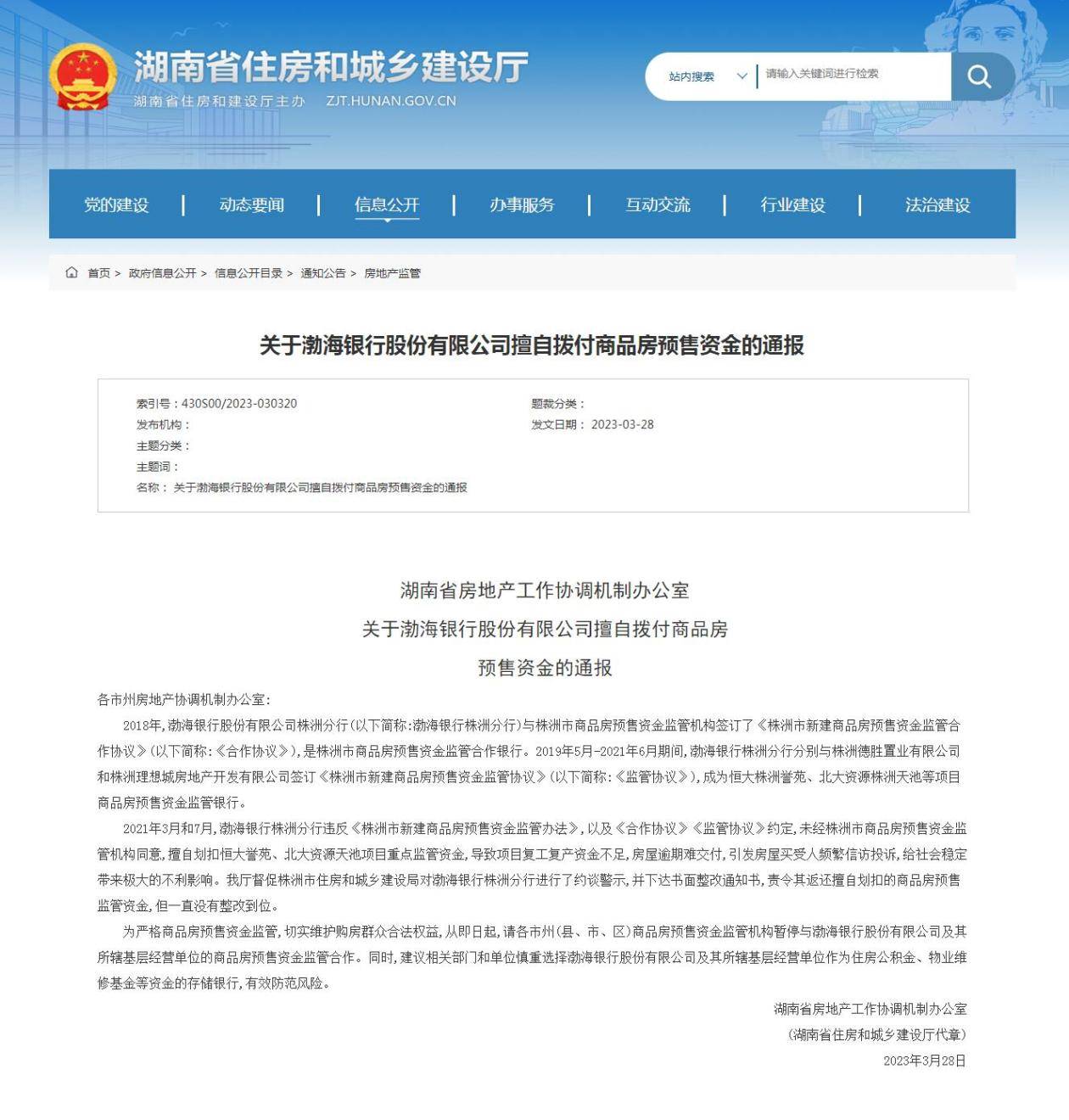 湖南省住建厅28日发布《关于渤海银行股份有限公司擅自拨付商品房预售资金的通报》,要求从即日起,各市州、县(市、区)商品房预售资金监管机构暂停与渤海银行股份有限公司及其所辖基层经营单位的商品房预售资金监管合作。为严格商品房预售资金监管,切实维护购房群众合法权益,省住建厅建议,相关部门和单位慎重选择渤海银行股份有限公司及其所辖基层经营单位作为住房公积金、物业维修基金等资金的存储银行,有效防范风险。(湖南省住房和城乡建设厅网站)