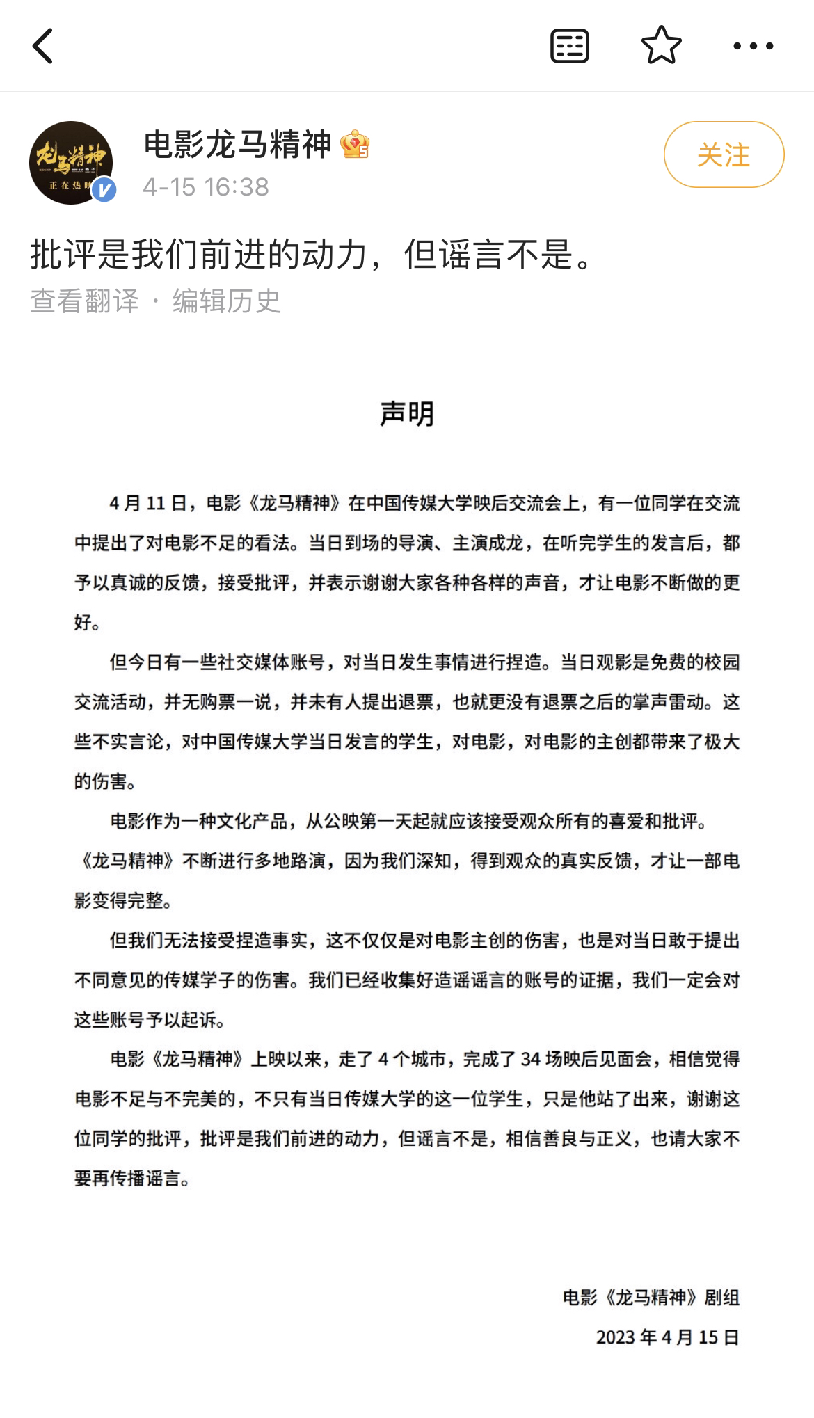 对此,官微在声明中表示,电影《龙马精神》在中国传媒大学映后交流会上,有一位同学在交流中提出了对电影不足的看法。当日到场的导演、主演成龙,在听完学生的发言后,都予以真诚的反馈,接受批评,并表示谢谢大家各种各样的声音,才让电影不断做的更好。但有一些社交媒体账号,对当日发生事情进行捏造。