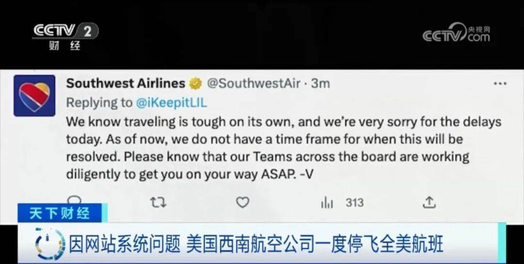 当地时间18日,主营美国国内廉价航空的美国西南航空公司因网站内部系统出现问题,向美国联邦航空管理局申请暂停全美所有该公司航班的起飞 。西南航空在社交媒体上表示,他们的官方网站和应用程序会间歇性出现问题,目前公司正在努力恢复网站的运行,并向所有被航班延误的旅客道歉。