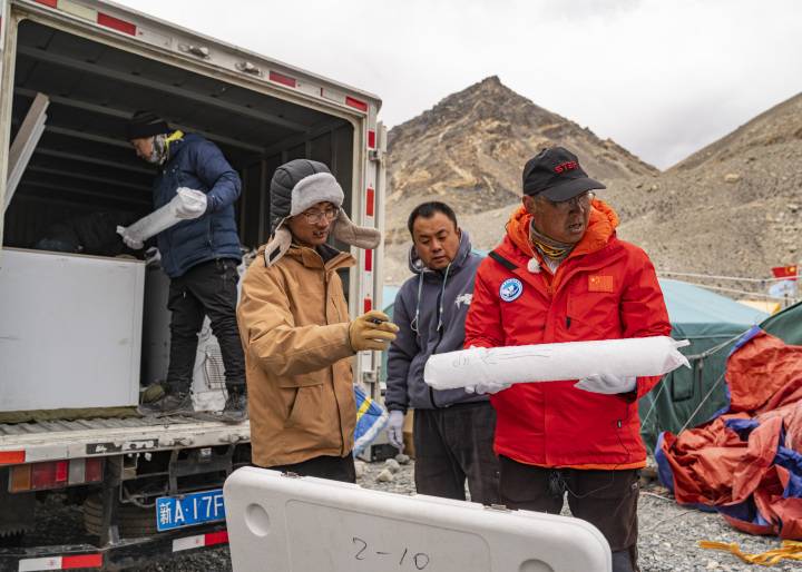 在珠峰登山大本营,中科院西北生态环境资源研究院副院长康世昌查看从珠峰海拔约6500米处钻取的冰芯样品(图源新华社)