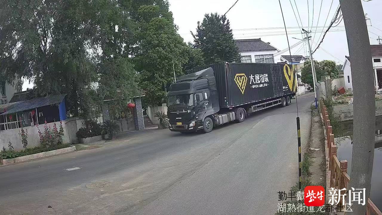 随后,湖熟交警中队的民警立即调出路口的公共监控视频。经查看,视频清晰地还原了一辆黑色的厢式货车经过此处时,由于车厢过高,拉坏线缆,并损坏墙体,随后逃逸。