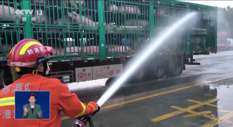 据驾驶员介绍,车上运载了130头生猪,当车辆行驶到山东临沂附近时,发现车上的生猪出现了中暑症状,随后便开到了毗邻的赣榆沙河服务区,发现部分生猪中暑症状加重,于是急忙拨打了119报警电话求助。消防部门提醒:车上运载的牲畜家禽等也要做好防暑降温工作,避免运输途中造成经济损失。