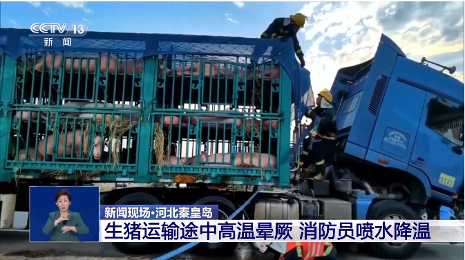 连日来的高温天气,让一些在运输途中的牲畜出现中暑现象。近日,在河北秦皇岛市昌黎县一处高速路段,一辆大货车抛锚停靠在路边,车上的160多头生猪在高温下出现晕厥,司机紧急向消防员求助。
