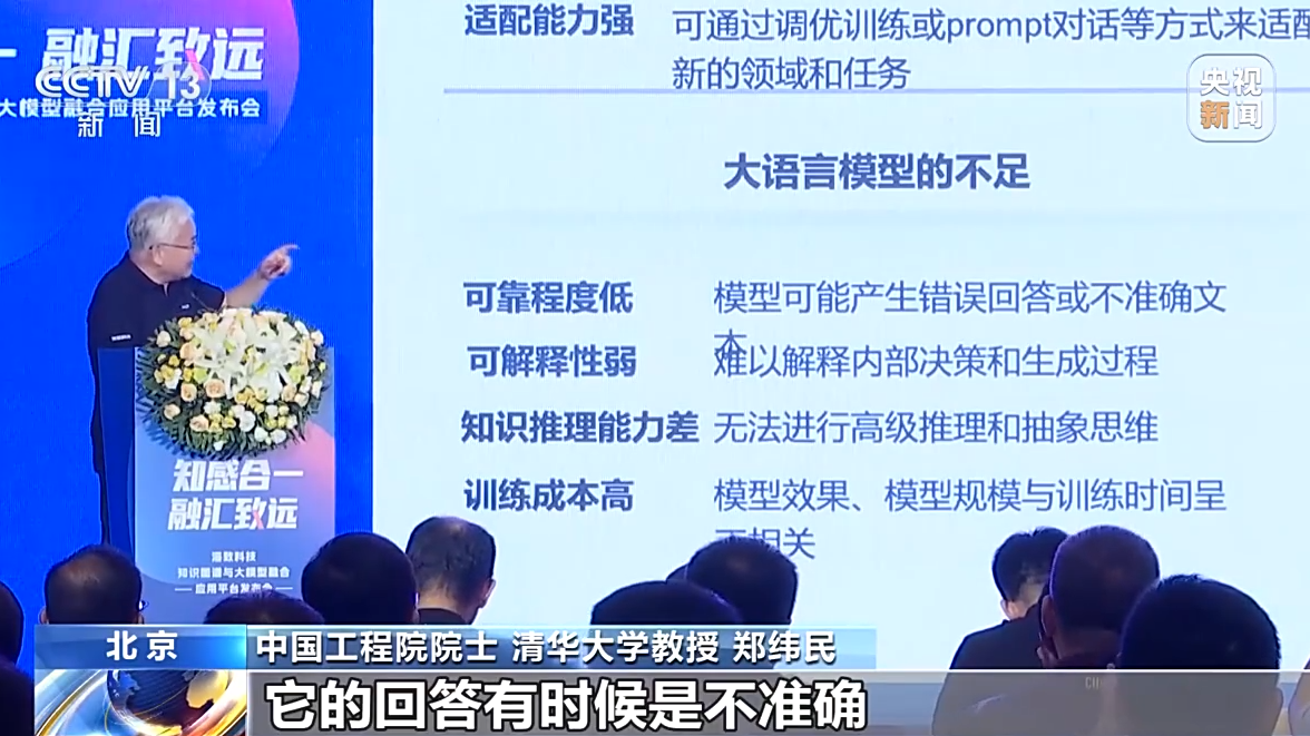 中国工程院院士、清华大学教授 郑纬民:大模型你问它什么问题,工业的、农业的、国民经济的,它都能回答,还回答得很快,它过一会儿就告诉你。这个是非常好的一件事,但是我们也发现什么问题呢,它的回答有时候是不准确,有时候有人说是胡说八道。