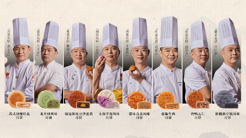 据介绍,月饼背后调味得到了重量级厨师团队加持,厨师团队来自融旅饭店旗下8家酒店,分别为南京中央饭店(苏菜)、长沙长城宾馆(湘菜)、福州梅峰宾馆(闽菜)、黄山翡翠度假村(徽菜)、杭州华北饭店(浙菜)、济南联勤宾馆(鲁菜)、广州珠江宾馆(粤菜)、成都新华宾馆(川菜)。厨师们凭借着对食材的敏锐洞察和对食物的独特理解,通过巧妙的搭配和精心的制作,将八大菜系的经典味道融入到月饼中。比如,川菜口味的藤椒牛肉月饼以麻辣味道为主,牛肉混合花椒独特的香气,给人带来一种辣中带麻的独特味觉感受;粤菜口味的月饼则以精选陈皮搭配香甜的红豆沙,再叠加甘香的咸蛋黄,让人仿佛置身于美食天堂广东;而苏菜口味的月饼则以糯米酒酿和桂花为主料,入口绵软香甜。品尝月饼还能更加深入地了解每个菜系的独特之处和历史渊源。