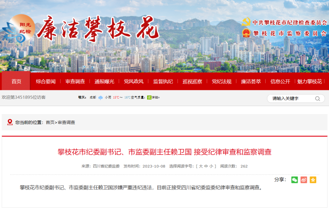 10月8日,据廉洁四川消息,攀枝花市纪委副书记、市监委副主任赖卫国涉嫌严重违纪违法,目前正接受四川省纪委监委纪律审查和监察调查。