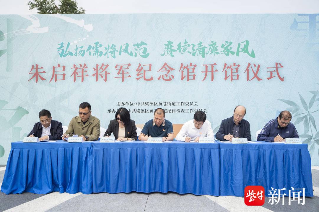 在开馆仪式上,朱启祥将军儿子原湖北鄂州军分区司令员朱健健及家属代表受邀专程从外地前来参加开馆仪式,并为纪念馆捐献铜像。现场举行了“1+6清风黄巷·党建‘廉’盟” 共建签约仪式。无锡市革命烈士陵园、无锡博物院、东林小学、无锡城市学院、无锡名人历史研究院、新四军历史研究会、黄巷街道党工委7家成员单位结对共建,依托朱启祥将军纪念馆作为廉政阵地,通过资源共享、制度共建、活动共联,进一步推动“新时代廉洁文化”品牌化建设。