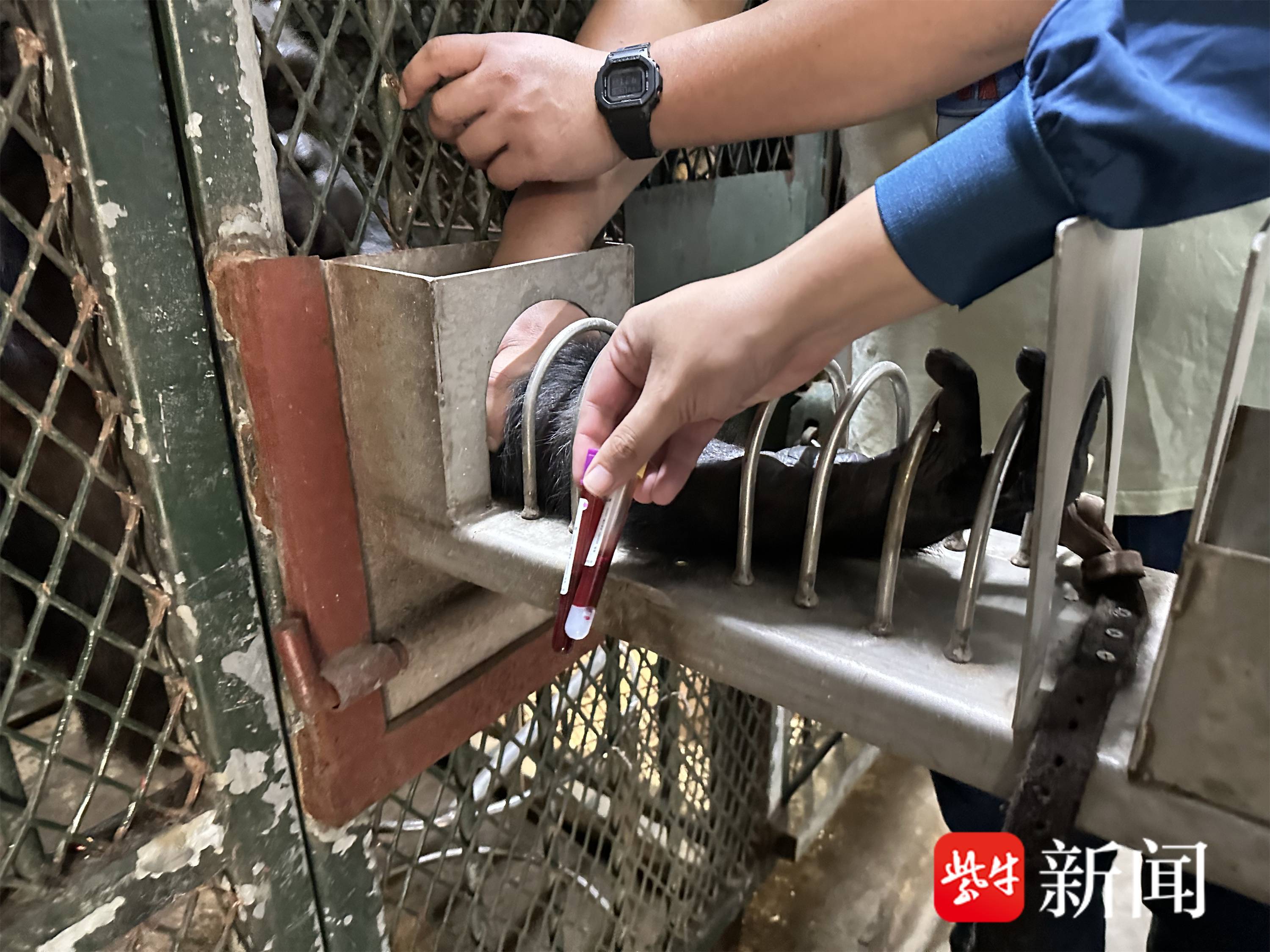 对于成年黑猩猩珍珠,在主管保育员李师傅的一声口令下,珍珠就会将手臂伸进特制的采血架中,兽医消毒之后看清血管,用手指按压血管,控制针和血管之间的角度,然后快速地将针头扎进血管抽血,静脉采血一气呵成。只要有李师傅的陪伴在旁,珍珠全程表现得都很乖。