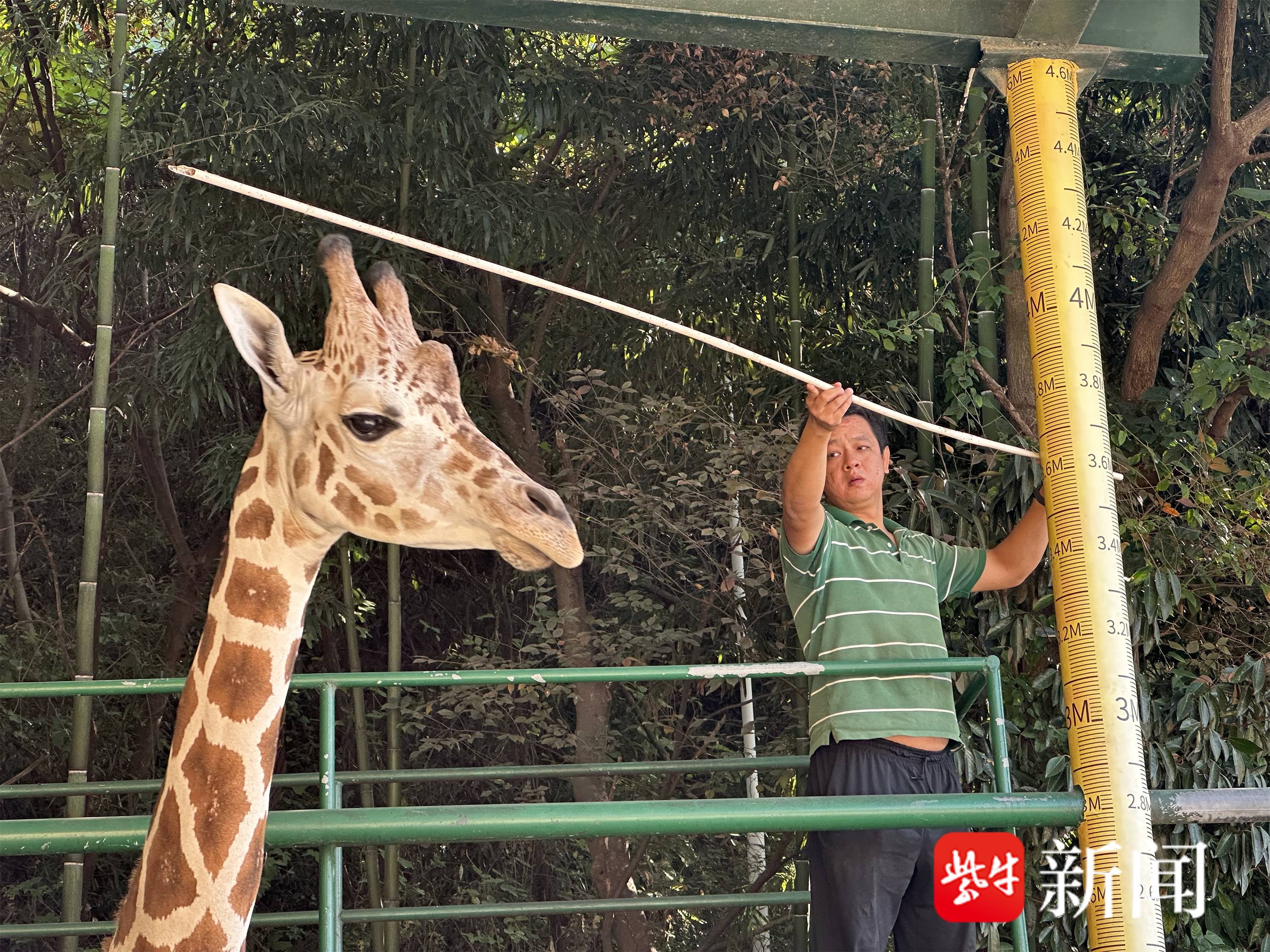 对于大高个长颈鹿——九儿、姗六,保育员季师傅用美食将长颈鹿“骗”至专属的脱敏笼中,量得九儿的身高是3.6m,地磅称得体重是601.5kg,量得姗六的身高是3.35m,称得体重为448.5kg。