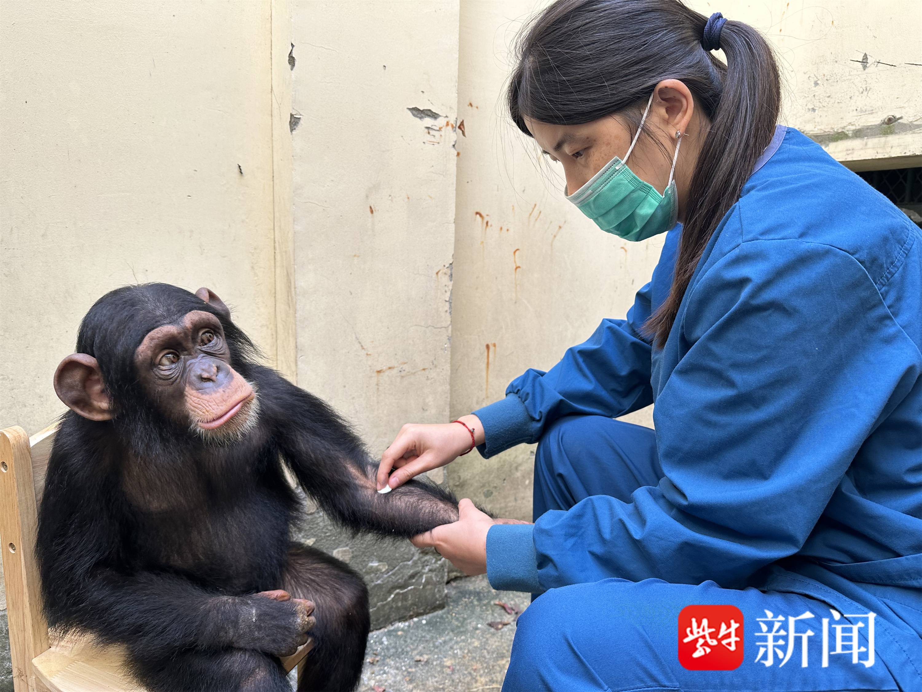 黑猩猩宝宝糖糖体检的时候不用隔笼操作,在李师傅的陪同下乖乖坐椅子上,兽医徐医生握着糖糖的手后,快速进行手臂静脉采血,糖糖除了有时候会撅着嘴表示小疼外,全程很乖巧,而李师傅也会奖励几颗它爱吃的枣子补补血。