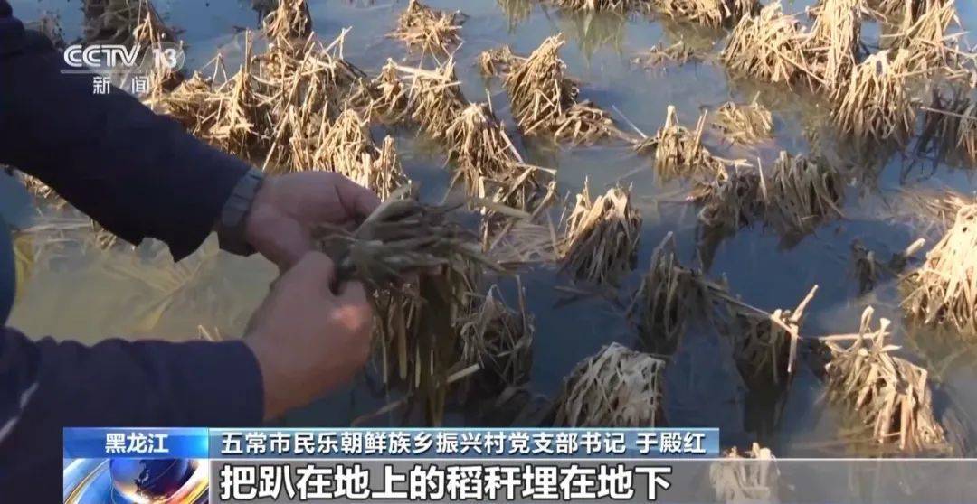 五常市民乐朝鲜族乡振兴村党支部书记于殿红:这块地块地势比较洼,水来得急,而且水上得特别深,原来挺高的稻秆,现在经过长时间的水泡已经趴在地上了。所以我们现在就马上进行秋翻,把趴在地上的稻秆埋在地下, 让它起到肥的作用。