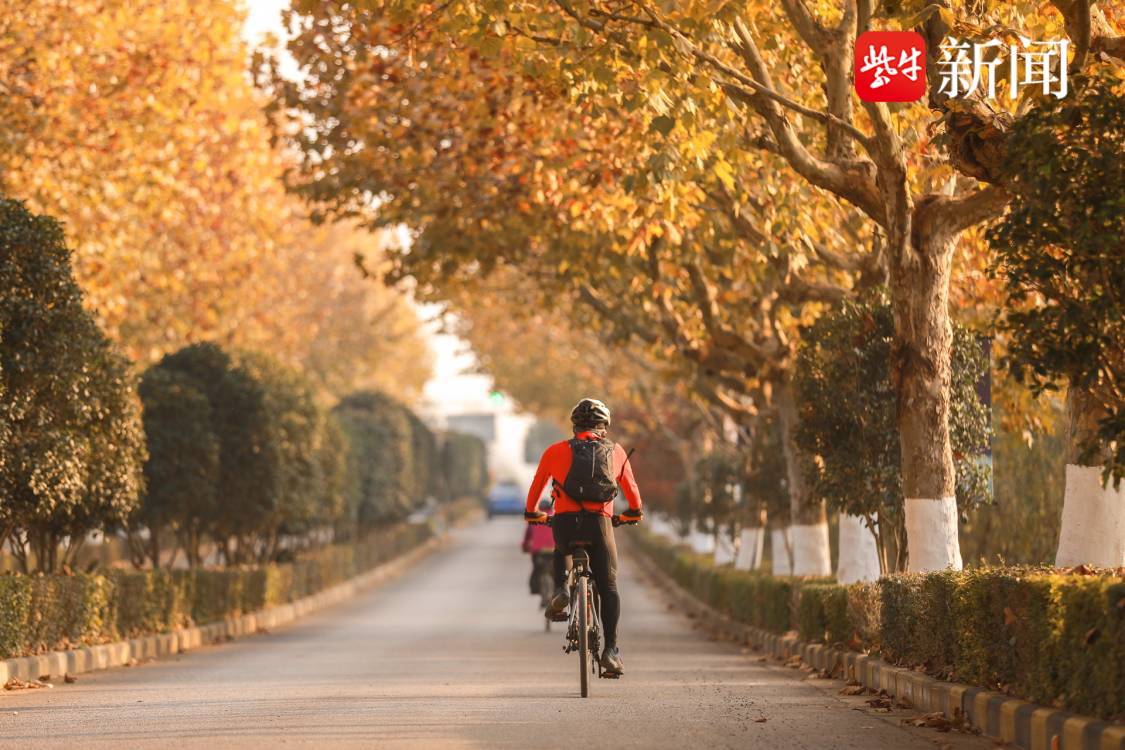 扬子晚报网11月23日讯(通讯员 笪倩倩 杨志国 记者 万凌云) 11月21日,游客在句容边城镇仑山湖梧桐大道骑行游玩。