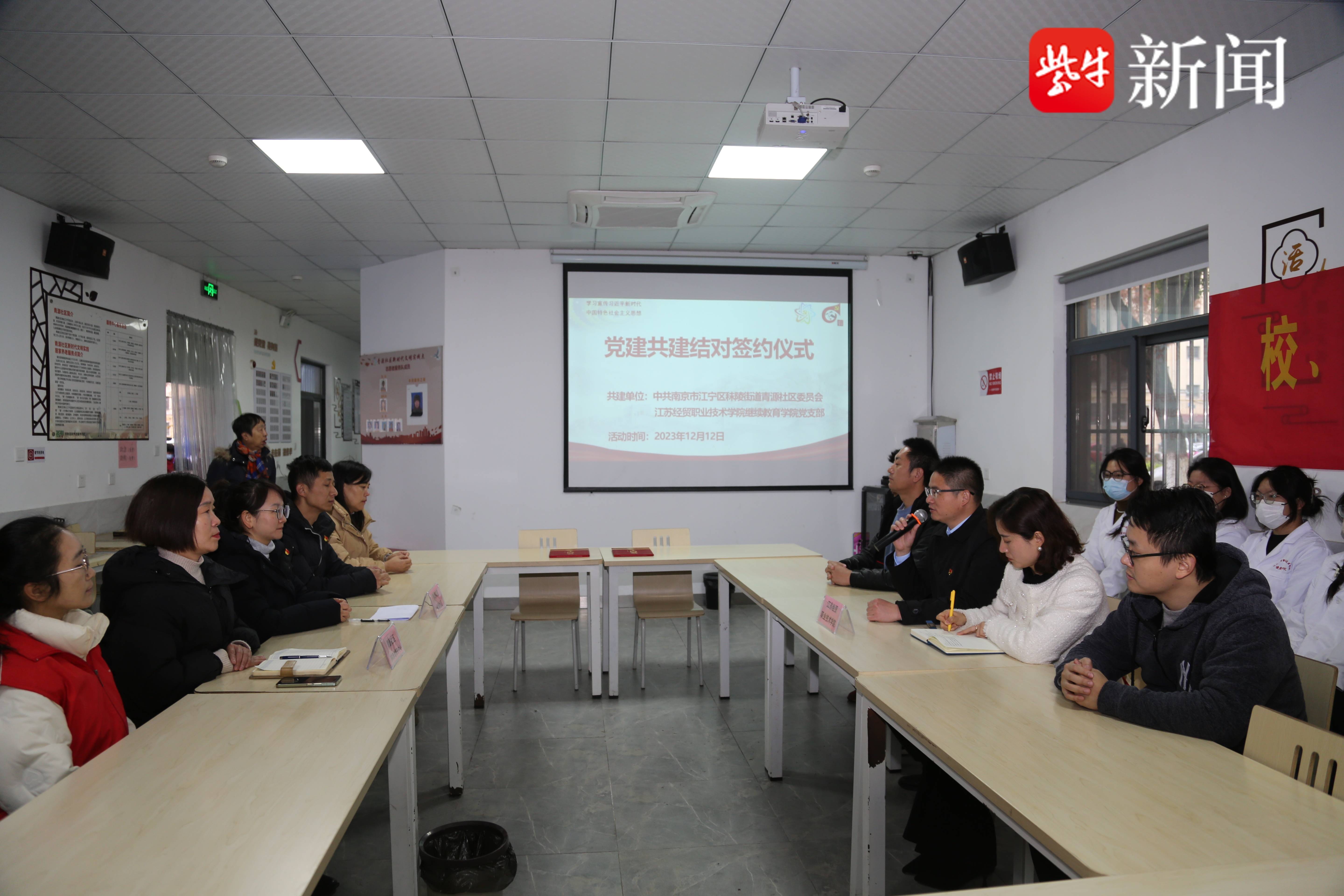 扬子晚报网 12月12日讯 (朱玲 时鑫 郑幼明 文/摄)为了深化社区党建引领,推动社区服务水平提升,12月12日上午,南京江宁区秣陵街道青源社区,在青源社区居家养老服务中心,与江苏经贸职业学院举办了“党建引领聚合力,凝心聚力共为民”党建工作结对共建签约仪式暨暖冬便民志愿服务。