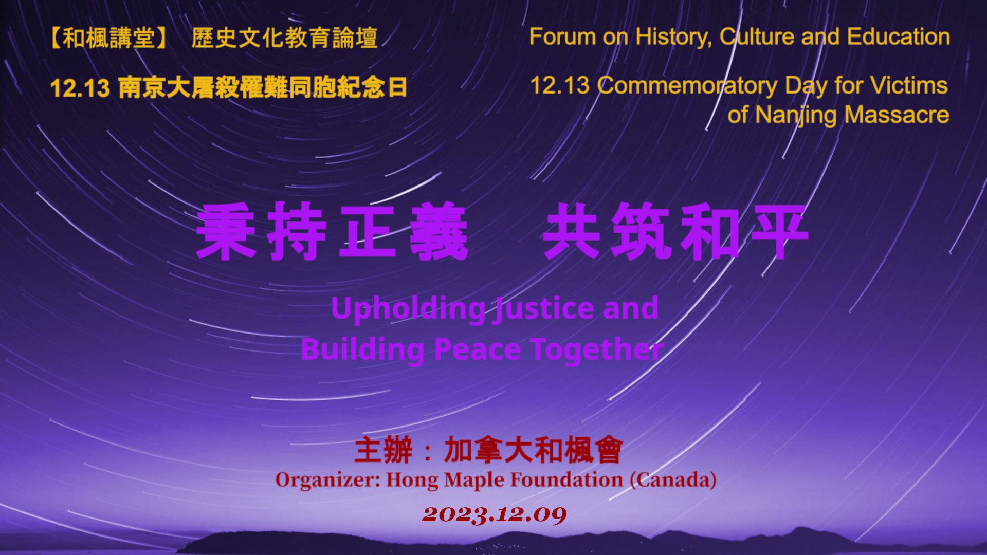 2023年12月9日,第十个南京大屠杀死难者国家公祭日来临之际,加拿大和枫会举办了纪念南京大屠杀罹难同胞的文化论坛。通过云端视频,参加这次活动的有加拿大国会代表,安大略省议会代表及多伦多市和约克区议员,中国驻加拿大多伦多总领事馆,加拿大政要,台海两岸的专家学者,以及北美多个维护史实、倡导正义,呼吁和平的民间组织。活动开始,与会者默哀1分钟,悼念南京大屠杀死难者。和枫会研究员(南京籍)曾平主持会议。