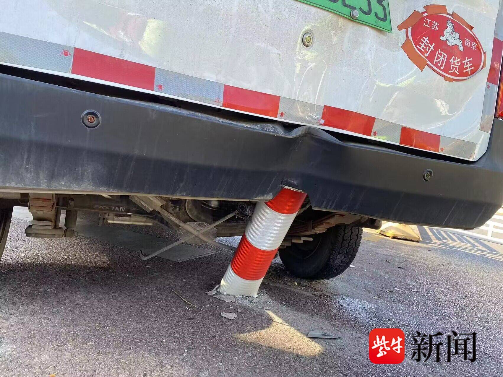司机右拐弯车速过快,面包车卡在隔离桩上