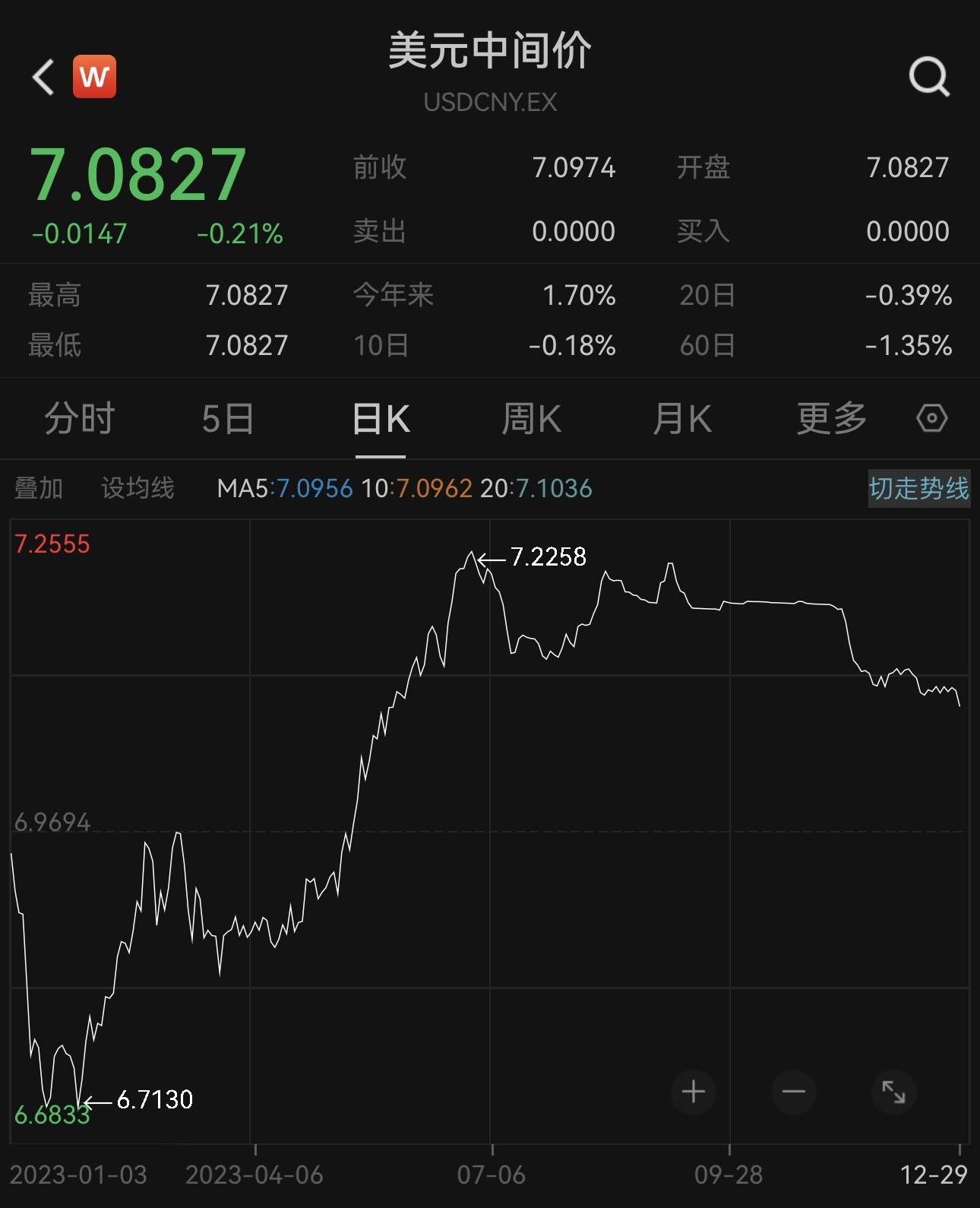 2023年人民币对美元中间价全年累计下跌近1.7%