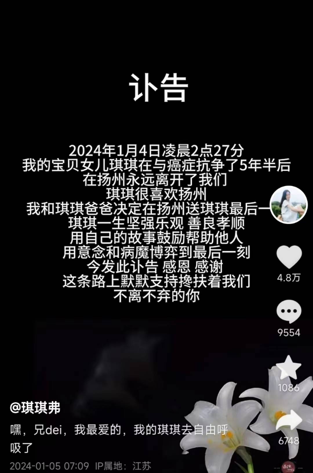 1月5日上午,琪琪弗父母在短视频平台发布讣告:“2024年1月4日凌晨2点27分,我的宝贝女儿琪琪在与癌症抗争了5年半后,在扬州永远离开了我们。琪琪很喜欢扬州,我和琪琪爸爸决定在扬州送琪琪最后一程。琪琪一生坚强乐观、善良孝顺,用自己的故事鼓励帮助他人,用意念和病魔博弈到最后一刻。今发此讣告,感恩、感谢这条路上默默支持搀扶着我们、不离不弃的你。”