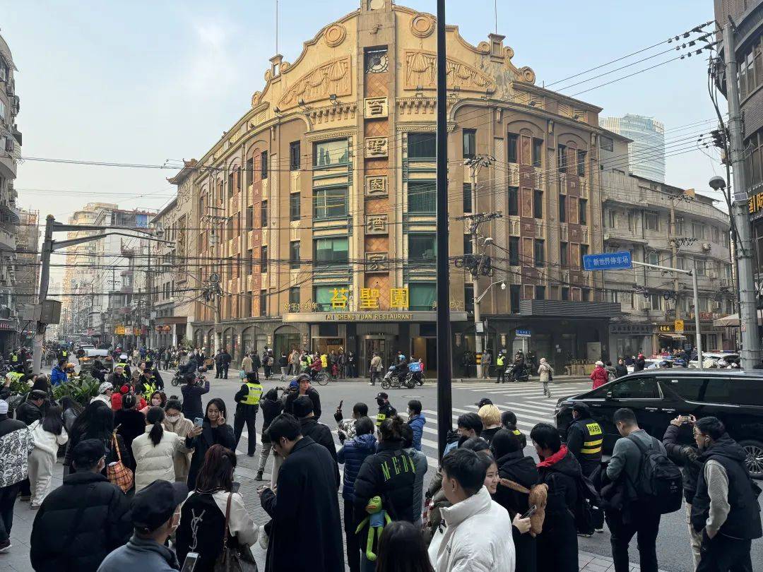 “这两天人特别多,都是来拍这个楼的。”1月9日,澎湃新闻在凤阳路黄河路路口看到,《繁花》剧中的“至真园”原型苔圣园酒家对面围满了前来拍照的剧迷。