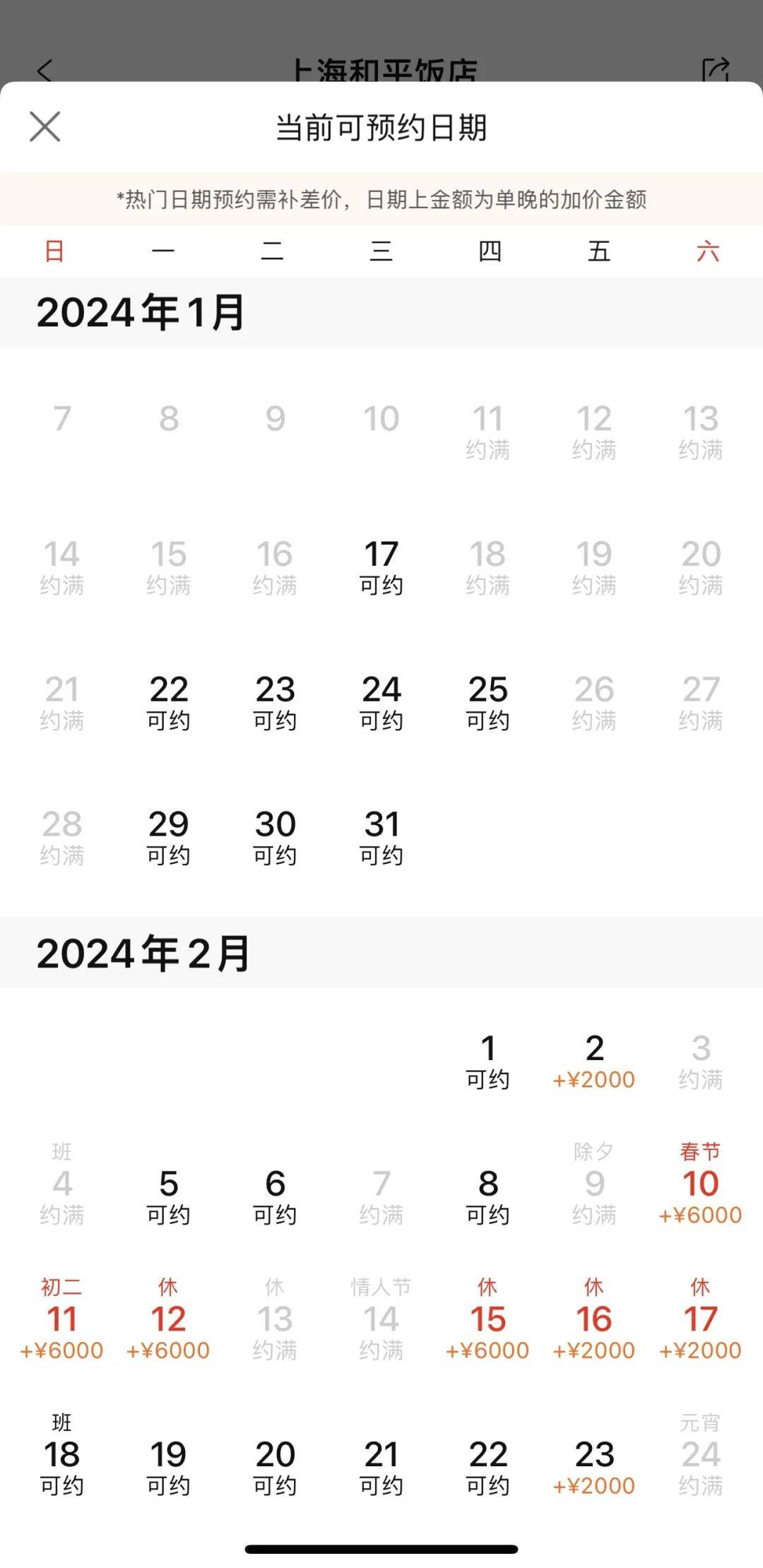 澎湃新闻搜索发现,在携程平台上线的上海和平饭店2天1晚英国繁花套房预售套餐中的可约日期显示,截至发稿,该套房在最近一周都已售罄,1月仅剩8个日期可以预约,而2月的第一个周末、除夕、情人节、元宵节等日期都已不可预约,也就是说,这些日期英国繁花套房都已被预订。而春节期间,英国繁花套房可加价6000元预约;非节假日的周五周六可加价2000元预约。