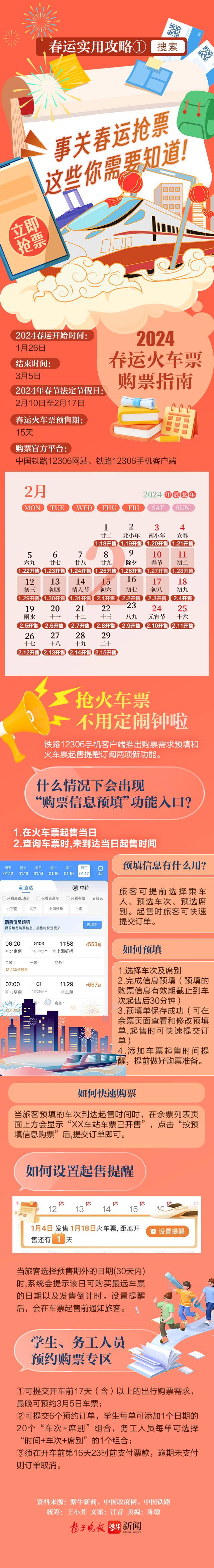 2024年春运自1月26日开始至3月5日结束,共40天。1月12日,2024年春运首日火车票正式发售。铁路12306手机客户端新功能上线,具体如何操作?事关春运抢票,这些你需要知道!收藏+转发,这份春运实用购票攻略请收好。