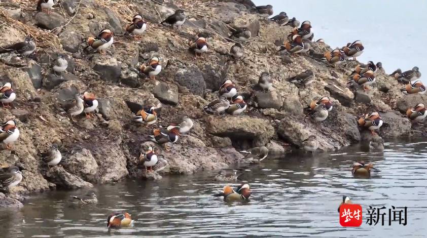 1月21日,记者获悉,在淮安盱眙天泉湖畔的一处山林里,观鸟爱好者近日进行鸟类观测时,惊喜地发现一个越冬的鸳鸯群,数量有100多只,它们与在此越冬的斑嘴鸭、绿头鸭、凤头鸊鷉等候鸟在天泉湖中戏水觅食,构成一幅和谐的生态画卷。