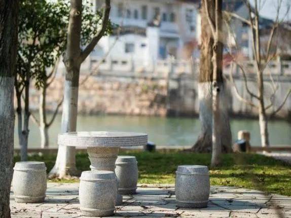 在林下空间搭建,塑木活动平台和休憩座椅,游园野趣尽享,在水边黛瓦白墙下,另辟观水饮茶的石凳石桌,古城雅致尽显。