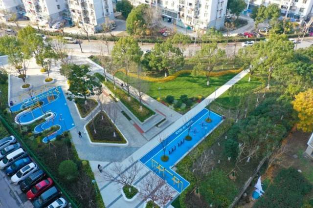石曲街南公园整治提升,利用原有园路及空间布局,增加儿童游玩和成人健身设施,打造了适宜不同群体的休闲空间。