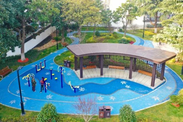 迎春路小游园此次整治增设了休憩坐凳及健身设施,新植樱花、桂花等花灌木,营造了四季有景,街角邻里友好型街边绿地。