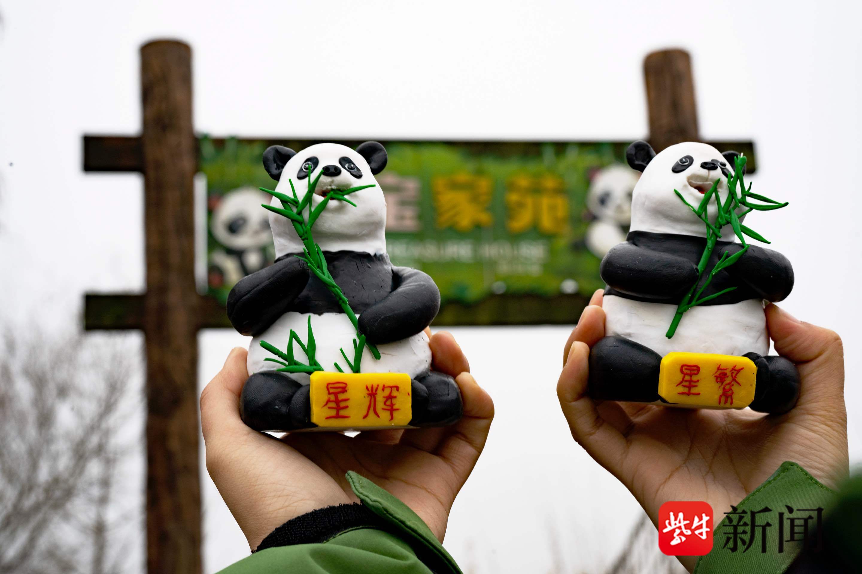 罗彬老师给这两只面塑大熊猫分别写上它们的名字,也祝福两只大熊猫在南通过一个幸福的新年。