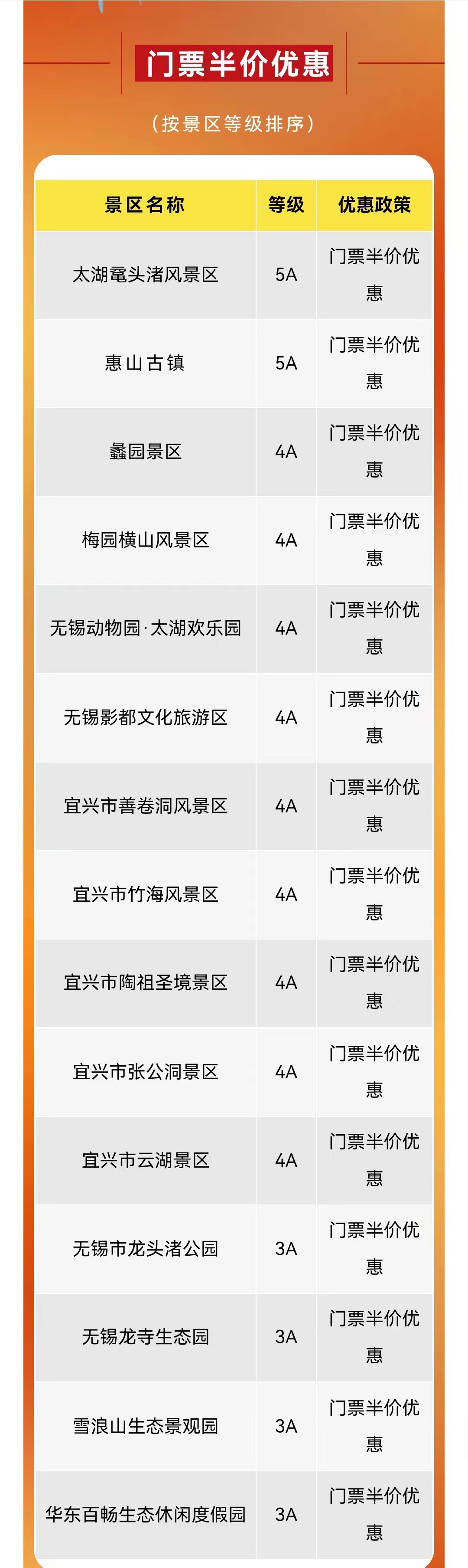 门票半价优惠景区名单