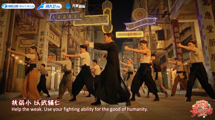 大家知道,动作片、武侠片在我们的影视语言系统中已经很成熟了,很多高难度的武打技巧,都可以通过镜头的运用、剪辑节奏的变化来更强大的视觉冲击。”节目中还适度运用了特效技术,比如360°拍摄的加入,可以凸显打斗过程中的极致瞬间,呈现各武术门派的招式动作,定格舞蹈姿态之美。在勘景、置景方面,主创团队也花了很多心思。成片中,观众既可以看到香港街头的霓虹灯招牌,又能欣赏到古色古香的岭南传统建筑,还有雪天、雨夜、凳子堆成的高台、蜡烛围成的光阵等风格化场景。