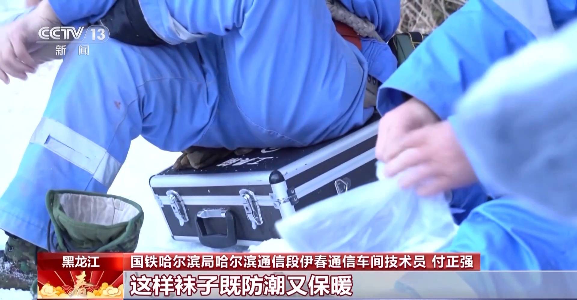 国铁哈尔滨局哈尔滨通信段伊春通信车间技术员 付正强:袜子外边套了层塑料袋,这样袜子即防潮又保暖,每天走近4万步,雪灌进去脚湿了老难受。