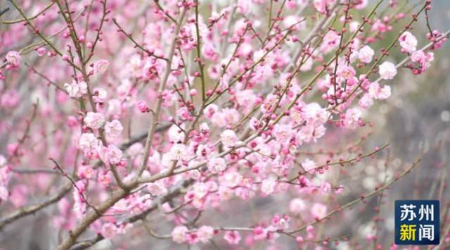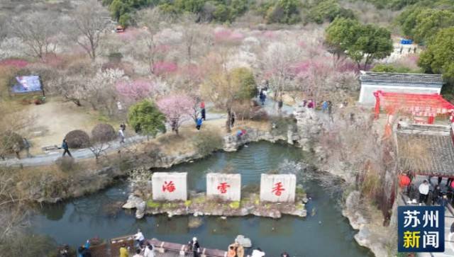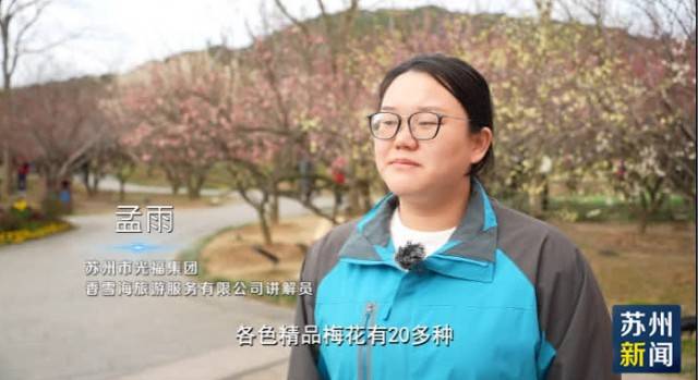 苏州市光福集团香雪海旅游服务有限公司讲解员孟雨表示,各色精品梅花有20多种,有墨梅、绿萼、雪见车等珍贵的梅花品种在景区里绽放,现在梅花也处于盛花期,整个院子里的梅花已经开到了有五成左右。