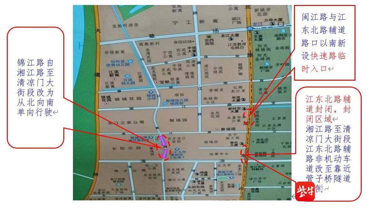 机动车通行:周边居民、单位及社会过境车辆需从草场门大街、闽江路、湘江路等周边道路提前进行疏导分流。锦江路(湘江路至清凉门大街段)改为从北向南单向行驶,并在闽江路与江东北路辅道路口以南新设快速路临时入口。