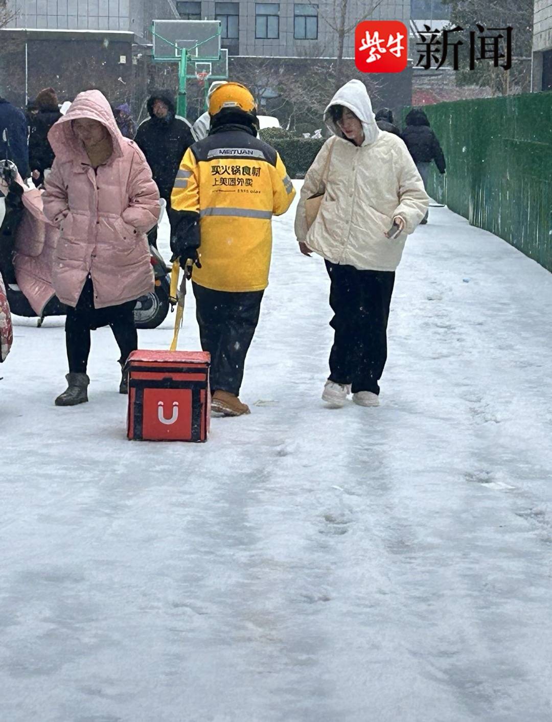 【视频】有人抱着外卖箱,有人拖着外卖箱,宿迁冻雨中外卖小哥艰难送餐,超时获市民理解