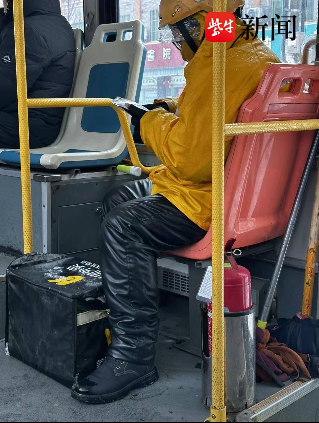 随着一组组市民分享的图片和视频在网络上流传,外卖骑手们的送餐方式引发了广泛的关注。他们有的坐在公交车的座位上,紧紧地抱着外卖箱;有的则冒着严寒,提着或拉着沉重的外卖箱步行在冰雪覆盖的道路上。