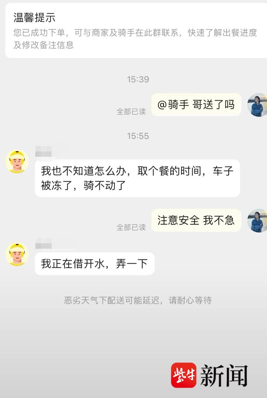 高先生原以为只有自己的餐晚了两个小时才送达,他将自己的经历分享出来后,引来了一群相同经历的市民。一市民下午15点39分咨询自己的餐什么时候送出,结果骑手告诉他只是取个餐的时间,车子被冻住了,骑不动了,正在借开水弄一下。这样的情况大部分骑手都遇到了,所以只有通过步行、坐公交车等形式送餐。
