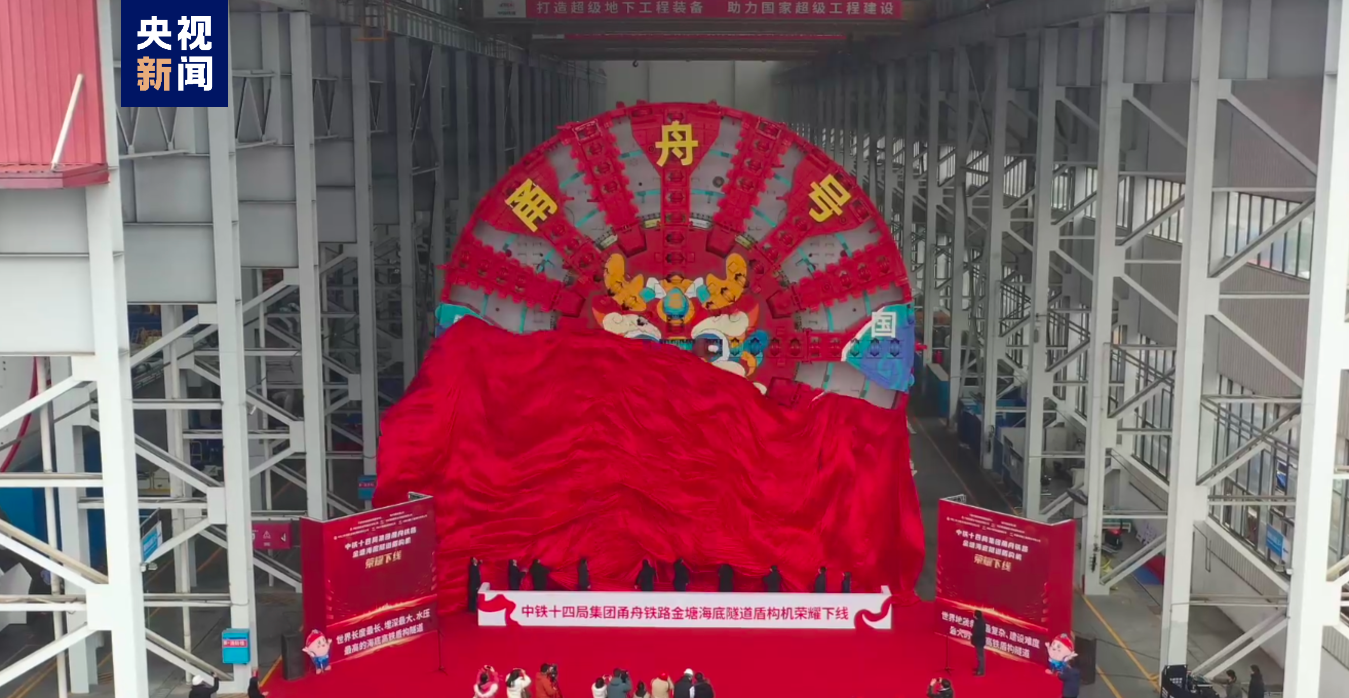 2月26日,一台刀盘涂装“瑞龙”图案的超大直径盾构机“甬舟号”下线,刀盘开挖直径14.57米,将应用于目前世界上最长海底高铁隧道——甬舟铁路金塘海底隧道宁波端工程建设。“甬舟号”盾构机由中铁十四局集团、铁建重工集团联合研发,全长135米,总重量4350吨,配备特制刀具308把,总装达到世界一流水平。