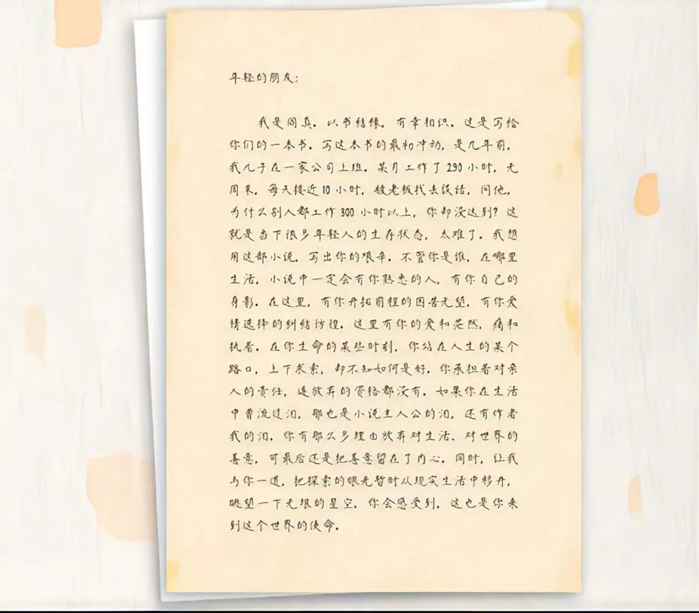 “年轻的朋友:在这里,有你开拓前程的困苦无望,有你爱情选择的纠结彷徨……在你生命的某些时刻,你站在人生的某个路口,上下求索,却不知如何是好。你承担着对亲人的责任,连放弃的资格都没有。如果你在生活中曾流过泪,那也是小说主人公的泪,还有作者我的泪。你有那么多理由放弃对生活、对世界的善意,可最后还是把善意留在了内心。”