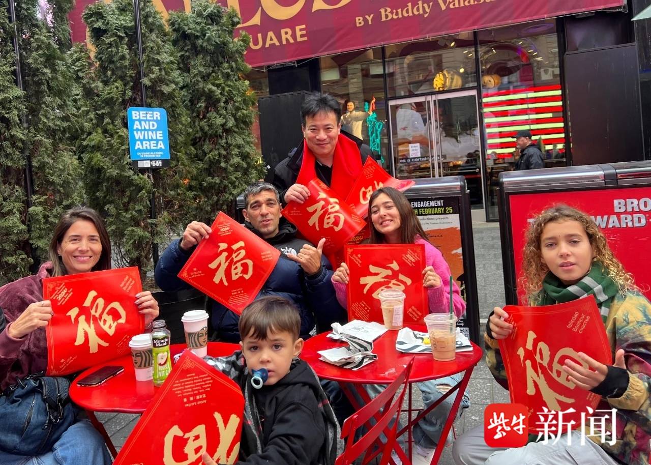 在纽约时代广场,来自世界各地的游客和美国家庭,接到印有联合国的官方语言英语、法语、俄语、汉语、西班牙语和阿拉伯语翻译的“福”字非常开心。特别日本、韩国友人,为来自中国的精美汉字“福”由衷点赞。